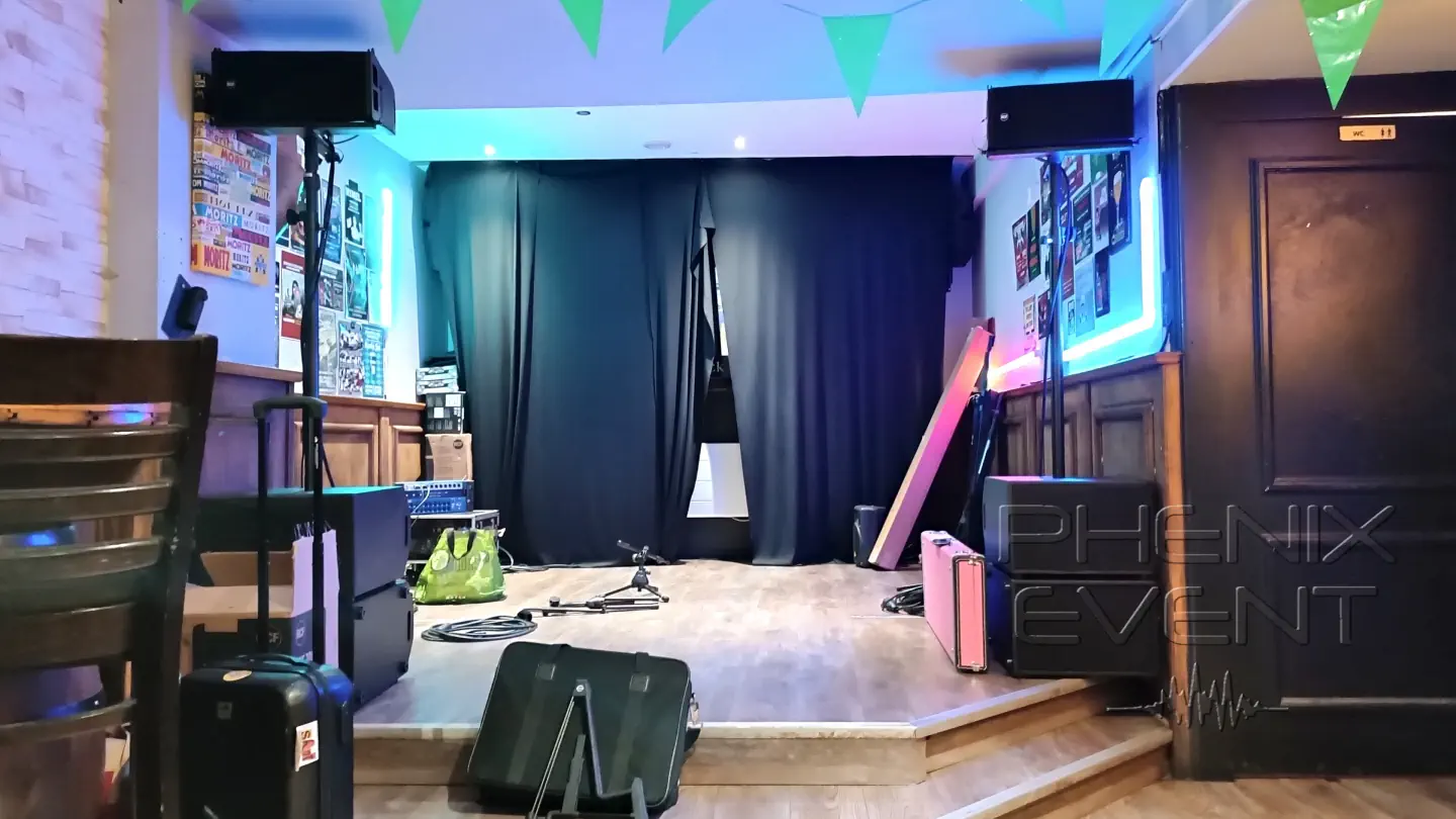 Au final, un système ultra compact qui fourni une bonne pression acoustique et permet aux musiciens d’être encore à l’aise sur scène. (J’avoue que, dès l’instant où j’ai monté le tube qui maintient les enceintes aigües / médiums, j’ai un chouilla serré les fesses : je n’avais, en amont, absolument aucune idée de la hauteur disponible sur scène. Finalement, c’est passé. Coup de bol… (il en faut aussi !)). Quoiqu’il en soit, les câbles sont tirés, la table de mixage parée et le système est prêt à faire feu. Il ne reste qu’à attendre que le batteur se mette en place.