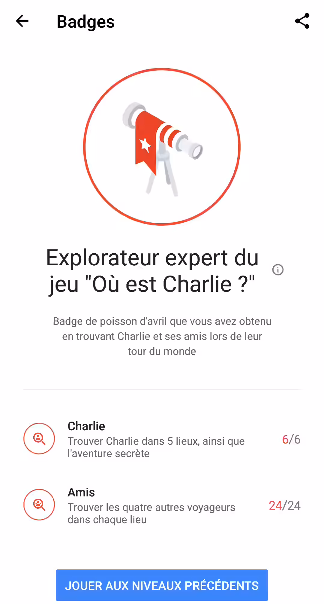 Eh voilà ! Lorsque vous aurez trouvé tous les personnages de chaque scène, vous aurez le droit à votre magnifique récompense : le badge « Explorateur du jeu Où est Charlie ? » spécial 1er Avril 2018 !