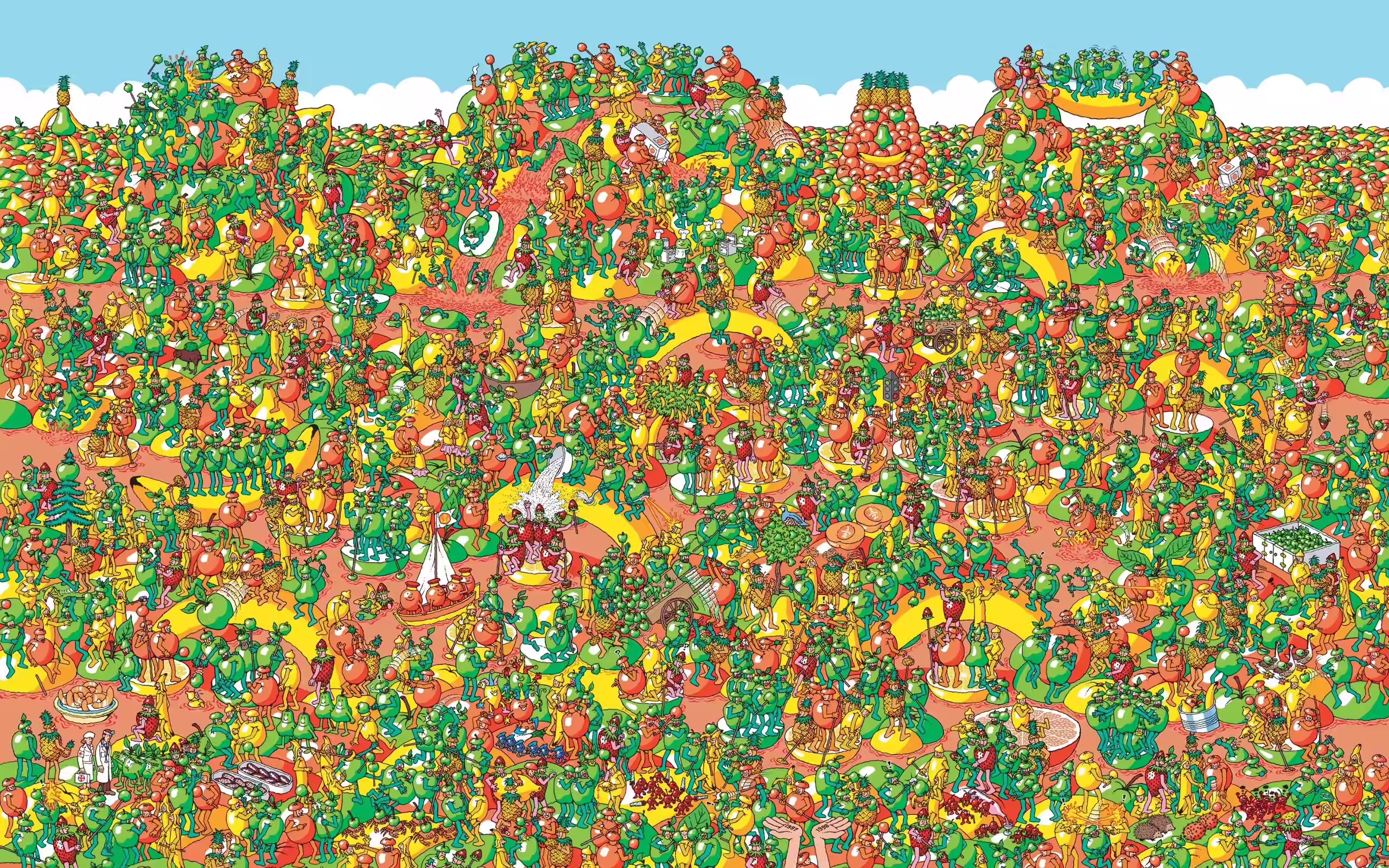 - Blanchebarbe : visualiser la cascade de jus de de fruit, juste en dessous de 2 mecs qui se fendent l’ananas : seule sa tête et son bâton dépassent derrière un groupe constitué d’une orange, d’une pomme et d’une banane. Non loin d’une banane qui fait le grand écart…