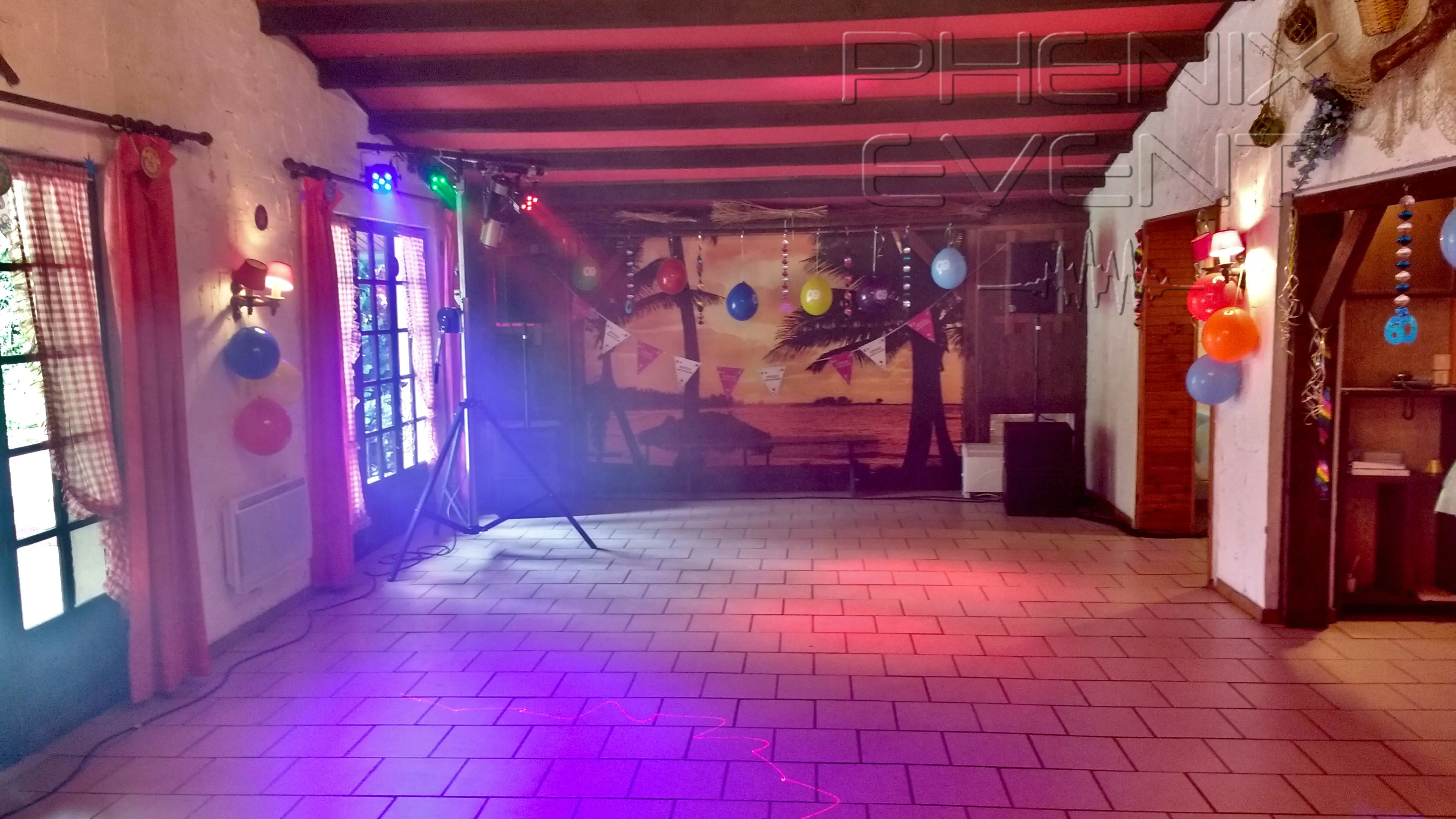 Le Pack Fête1 reprend place dans le hall : trépieds, projecteurs LED, scanners pro et machine à fumée discrète sous un pied. Les couleurs s’entrelacent et transforment l’entrée en piste de danse improvisée. ne reste plus qu’à attendre la tombée de la nuit pour profiter pleinement du spectacle…
