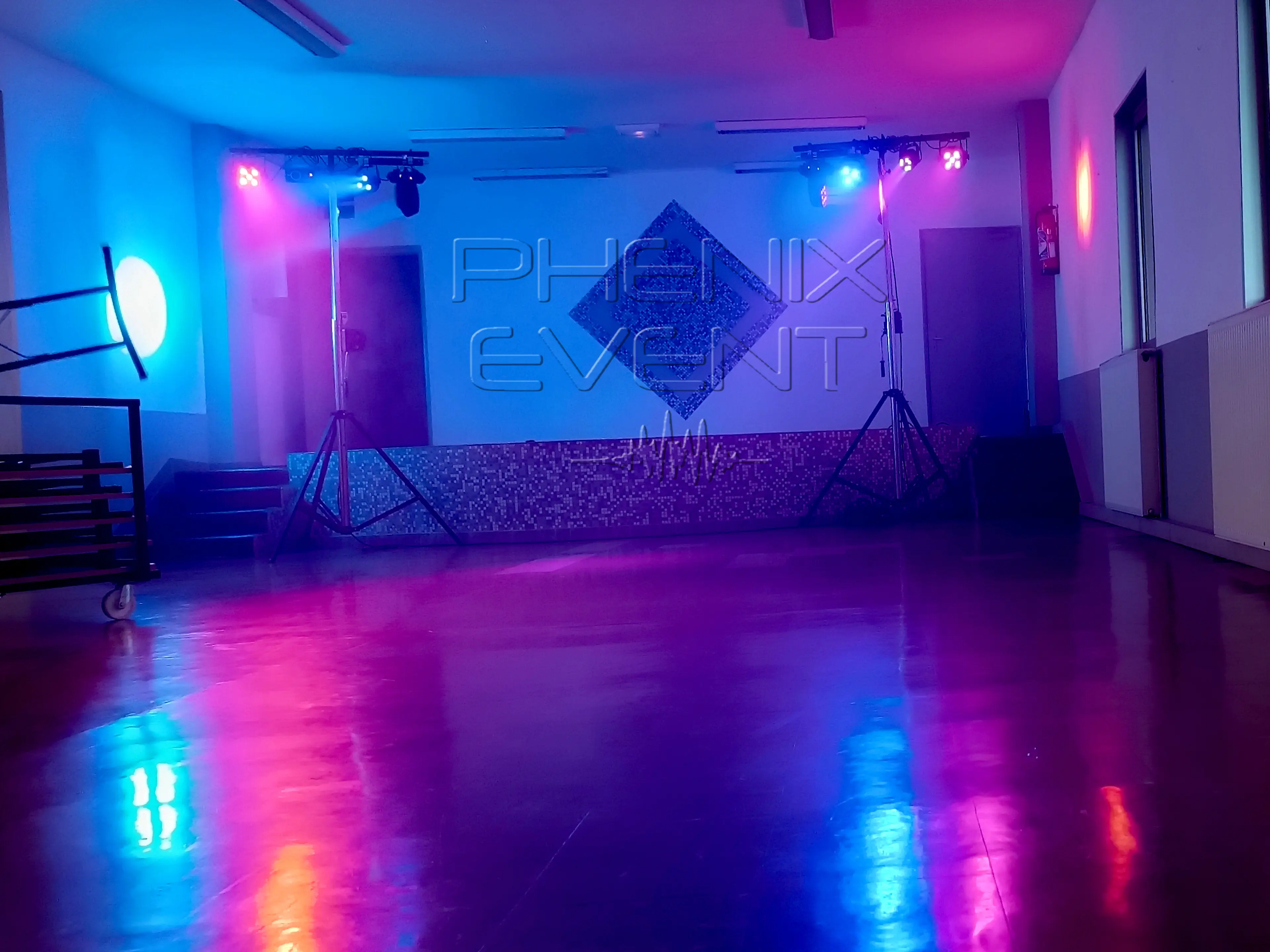 Jour de l’événement, je débarque au foyer en fin d’après-midi, comme il était conevnu. Murielle et Sébastien m’accueillent avec le sourire. Déchargement du matériel, puis découverte de la salle : spacieuse, équipée d’une scène fixe, en dur.