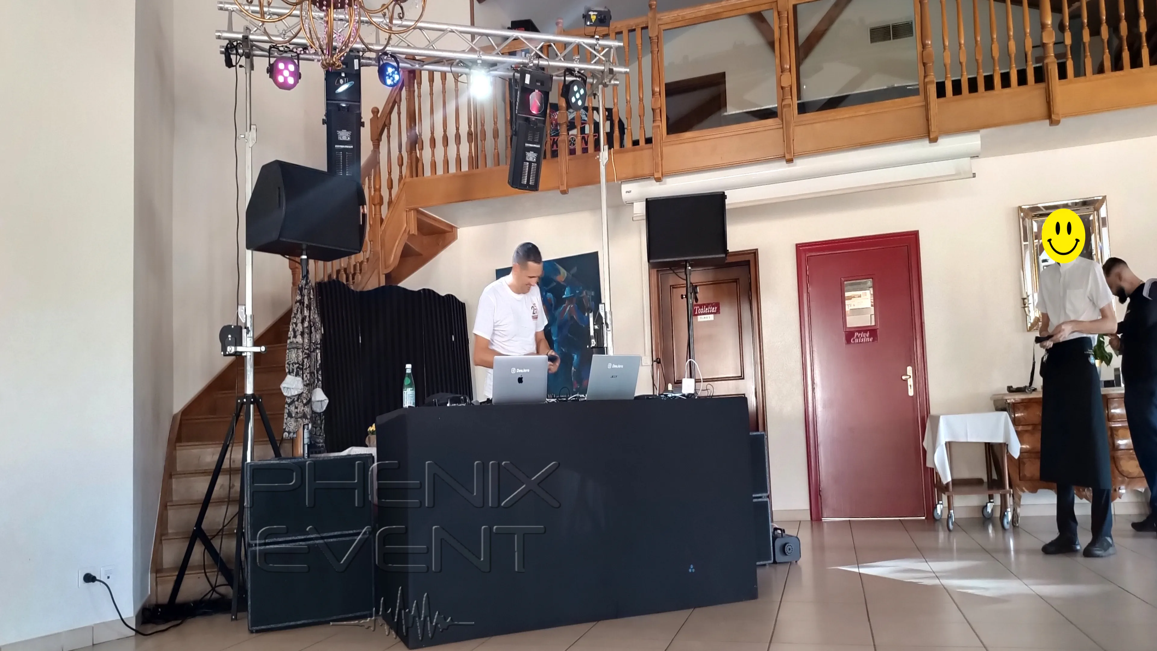 La veille de l’événement, nous organisons une visite sur place avec les clients du DJ pour déterminer l’installation optimale. Premier constat : la salle n’est pas spécialement bien agencée pour recevoir un prestataire son & lumière externe. Plutôt conçue à nos yeux comme une salle de réunion, elle présente plusieurs contraintes. Heureusement, une visio avec Vahe nous permet d’affiner les choses. (La longueur du pont de jeux de lumière de 4m initialement prévu devra être revu à la baisse faute de place)