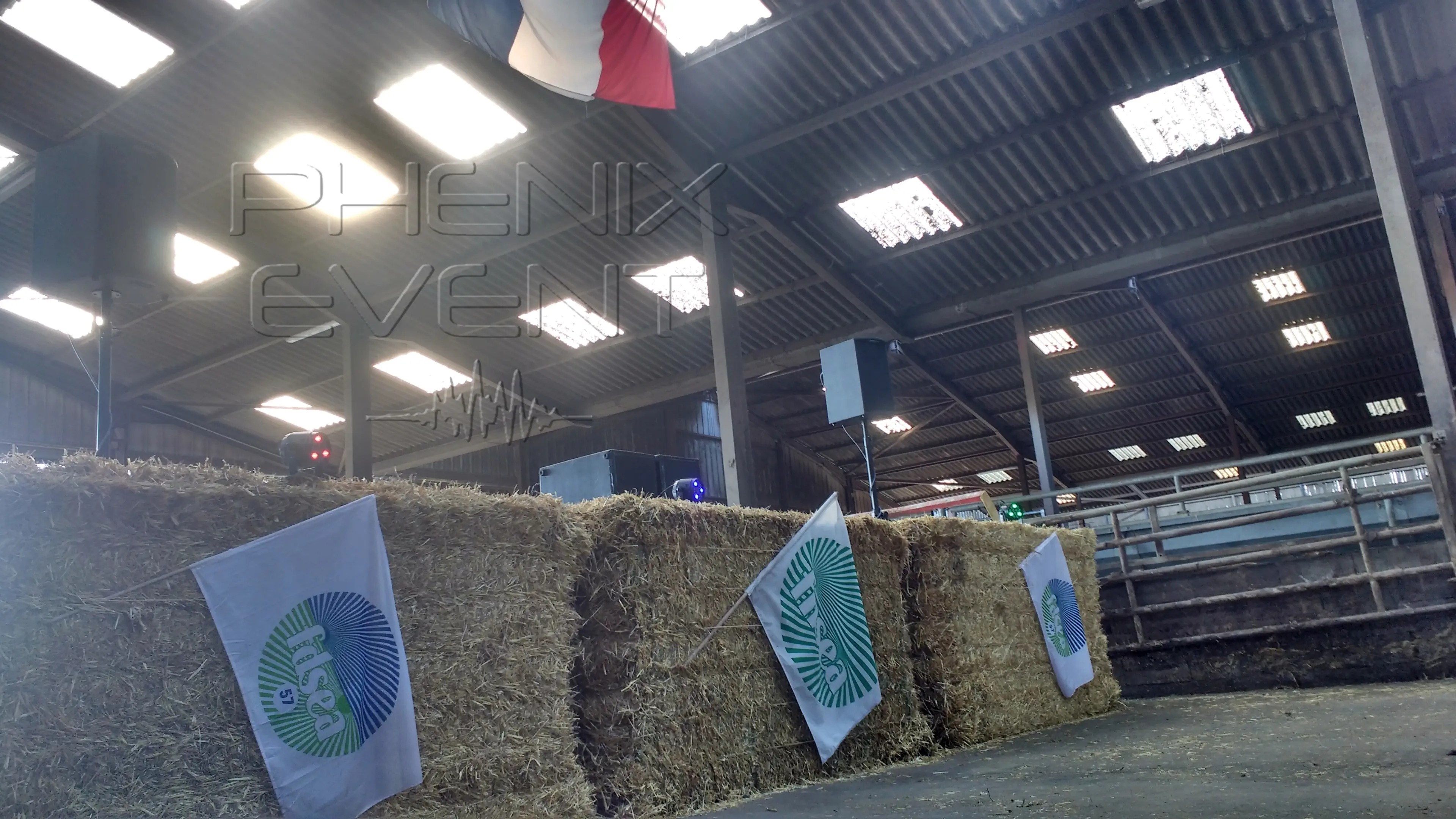 vue de face, la sono 2000w et les projecteurs installés sur les bottes de pailles dans le hangar de la ferme