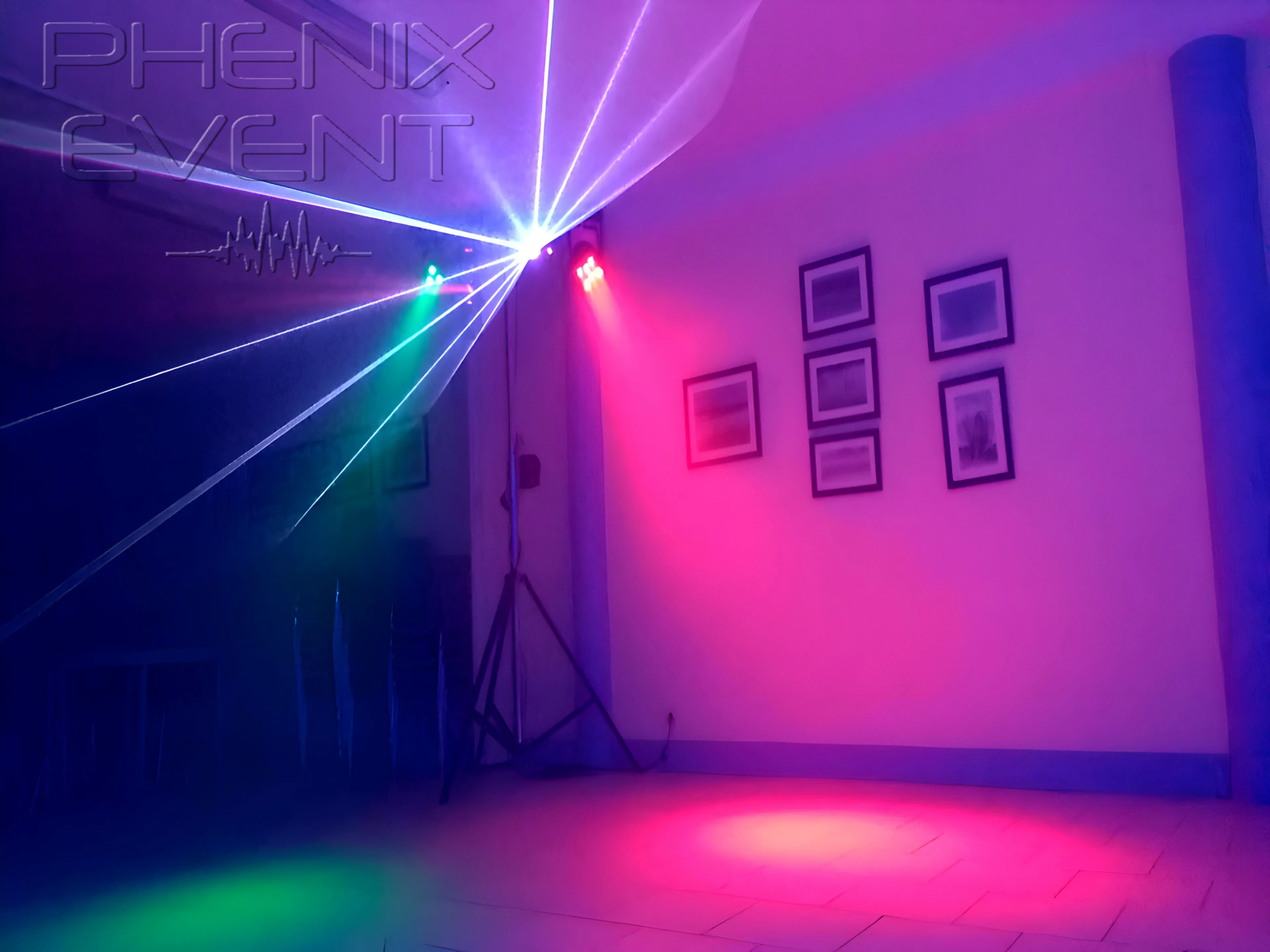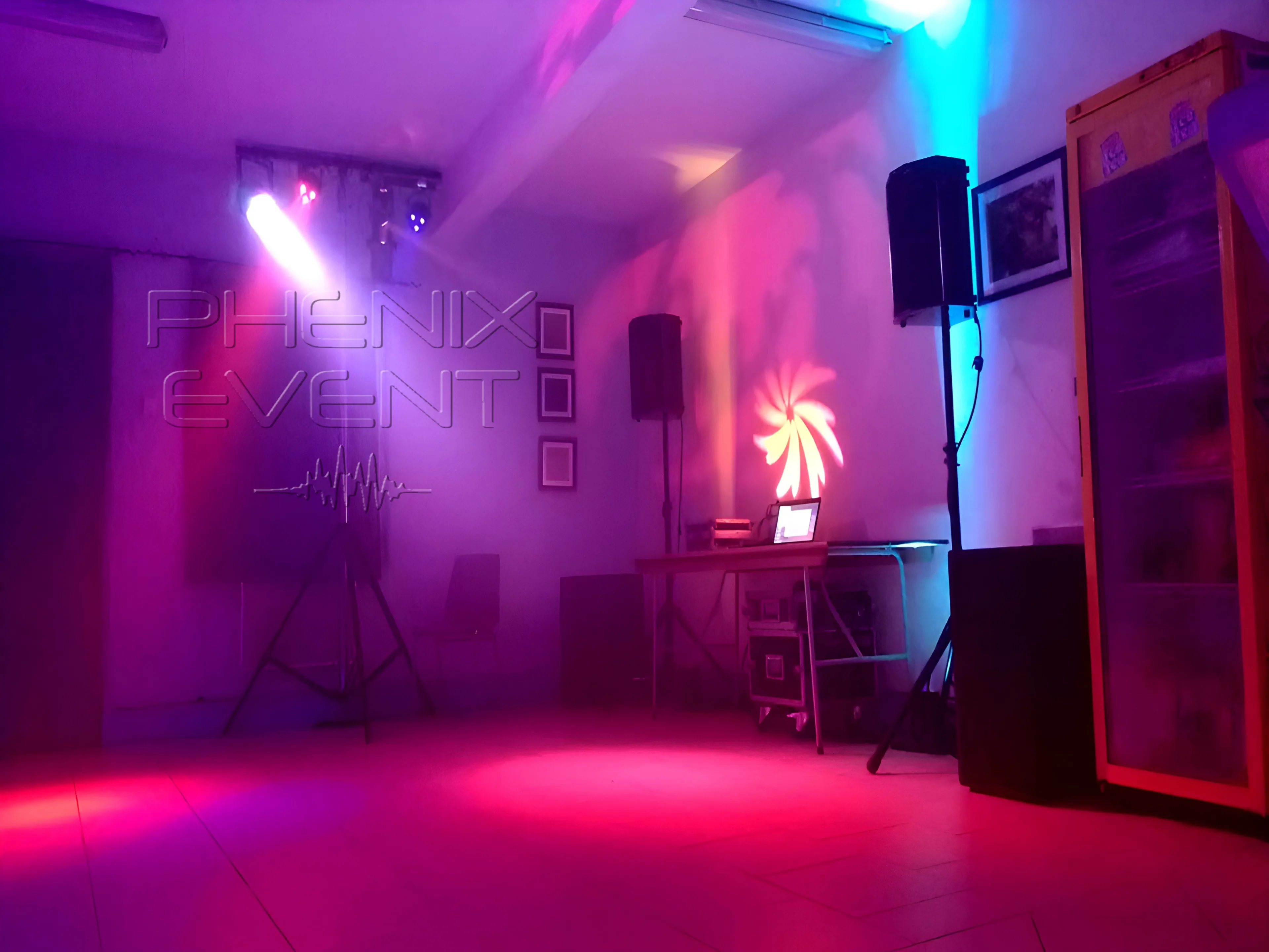 Je passe à présent à l’installation du Pack Fête 1 et de ses jeux de lumière : un trépied lumineux est déployé dans la salle, affleurant un mur, l’autre juste à côté de la porte qui mène sur la terrasse. Je les hisse, ho hisse la saucisse, le plus haut possible afin de pouvoir exploiter au maximum le mirifique rendu lumineux qu’octroie ce système de jeux de lumière unique issu de l’ingénierie estampillée Phenix Event.