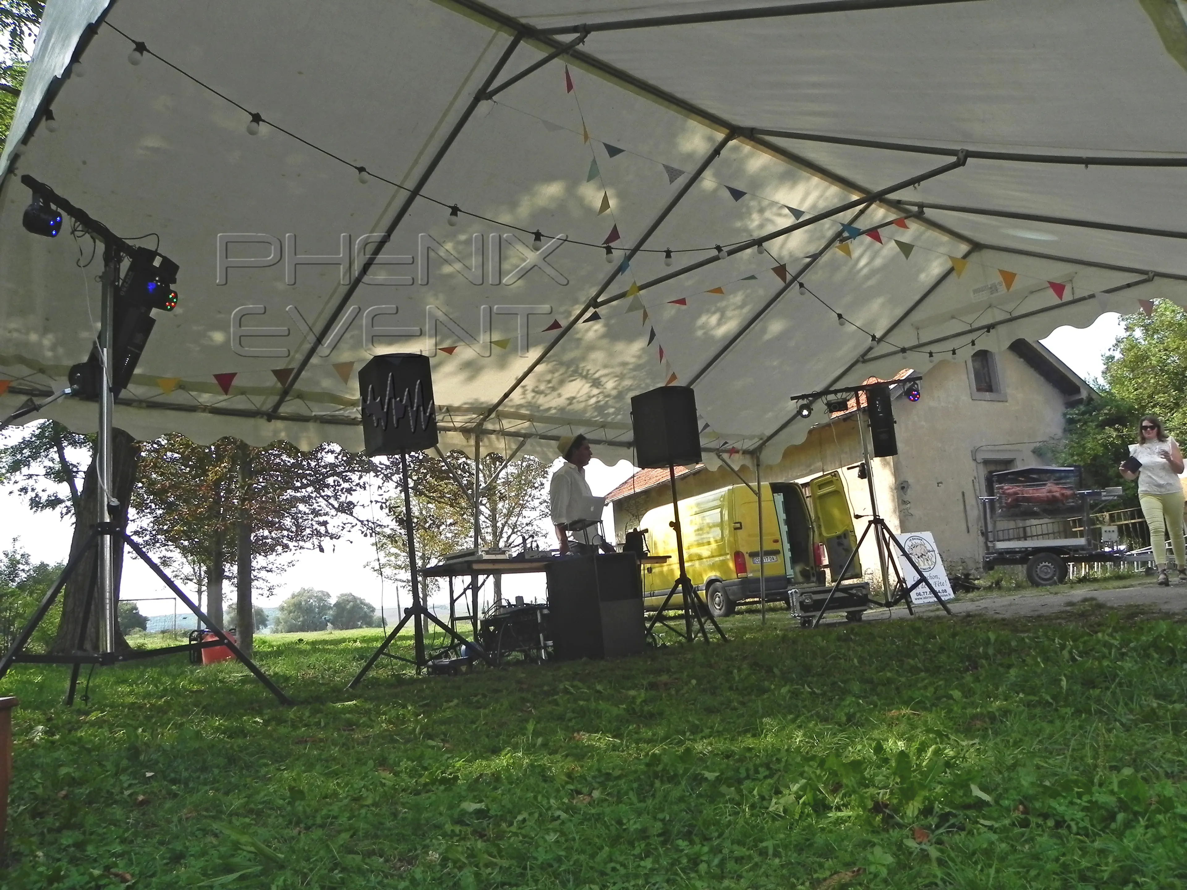 Je passe ensuite à la lumière et déploie le Pack Fête 1 : ici, pareil, je place un trépied à gauche et l’autre à droite. Je les équipe des effets lumineux à LED ainsi que des scanners Electroconcept, les oriente afin de couvrir au maximum la piste de danse herbacée puis hisse le tout. Branchements et mise en fonction. Etant donné que la tonnelle est en forme triangulaire, pas bien haute, et que les trépieds sont placés aux extrémités de celle-ci, les jeux de lumière ne sont pas hissés bien haut… mais ça fera tout de même le job.