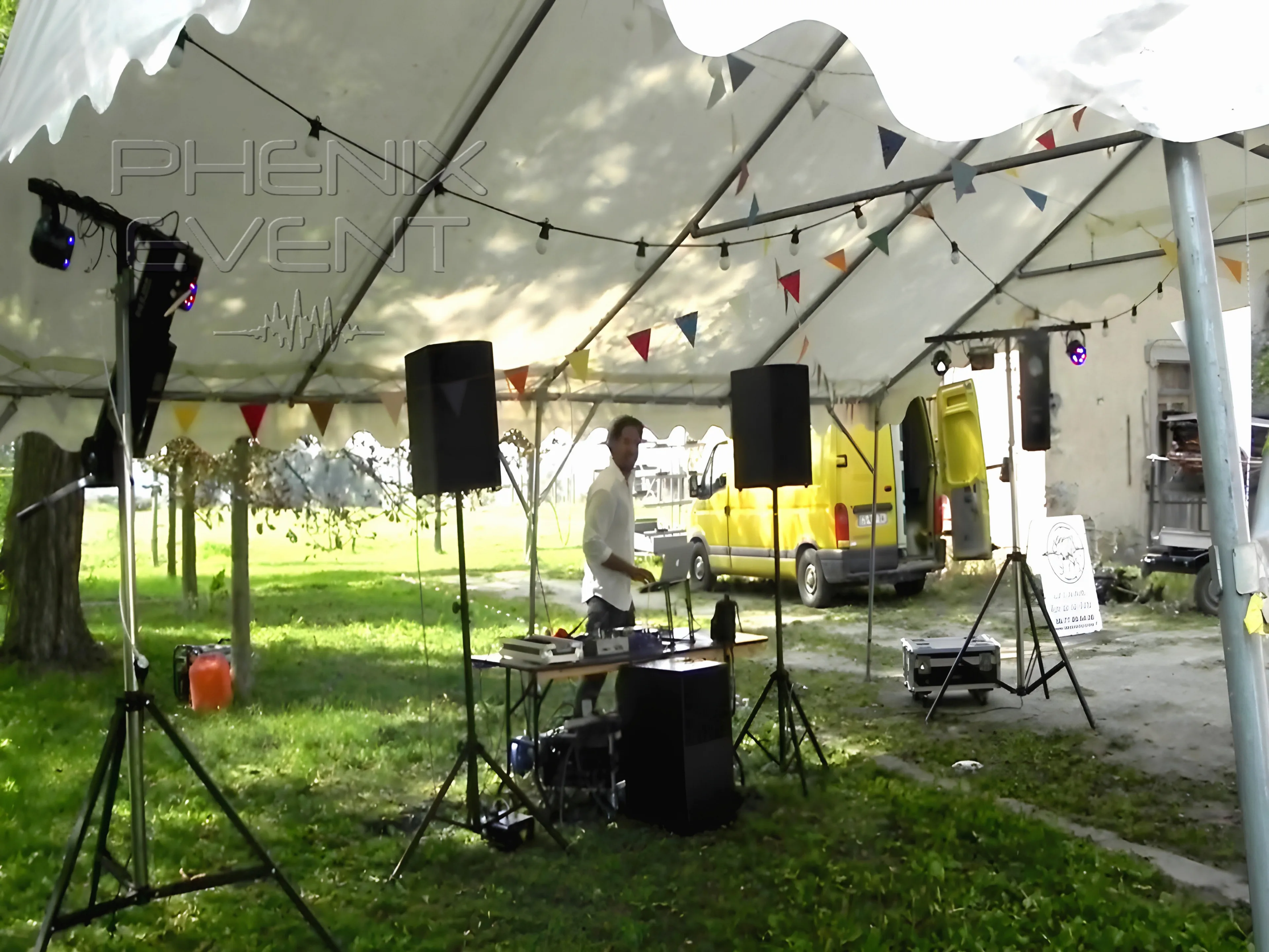 Le DJ de la soirée est déjà sur place. Très sympa, le courant passe tout de suite. Nous installons ensemble sa table DJ immédiatement. Du temps qu’il déballe et agence son matériel, je déploie la sonorisation : une enceinte 500w à gauche de la table, sur trépied, l’autre à droite. Le caisson de basses est placé au centre. Le rack d’ampli planqué sous la table. Je raccorde toutes les enceintes et mets en fonction le système.