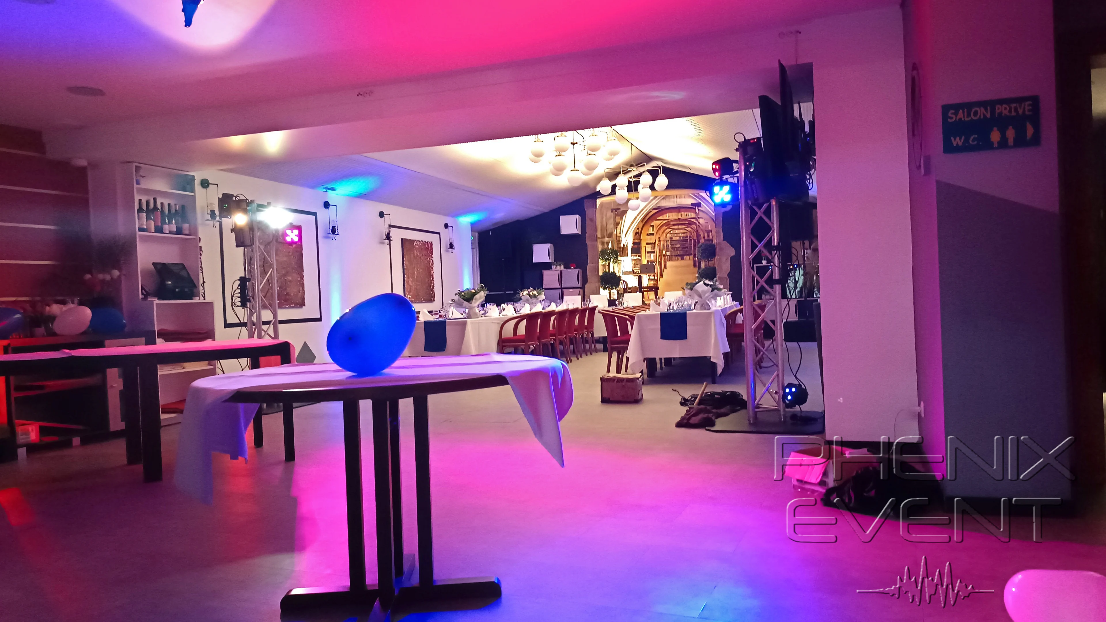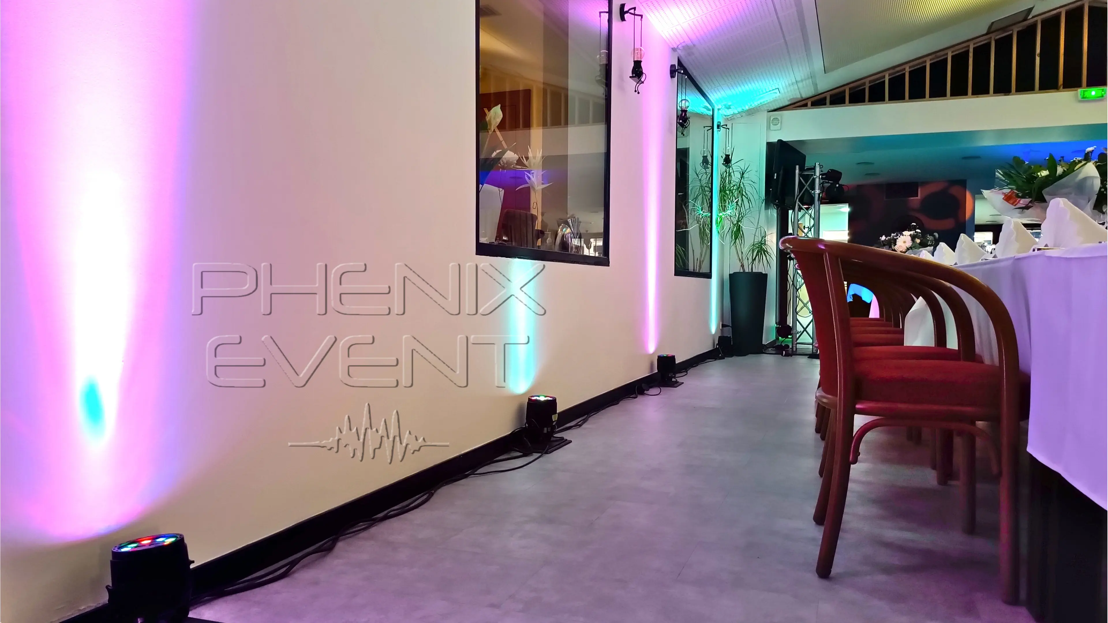 Ayant déjà fait un repérage des lieux en amont, j’avais anticipé le manque de hauteur sous plafond. Le Pack Fête 1 est donc installé sur totems 2 mètres plutôt que sur trépieds. Certes, c’est un peu plus long à monter, mais le résultat en vaut la peine et le système lumineux s’adapte parfaitement bien au lieu.