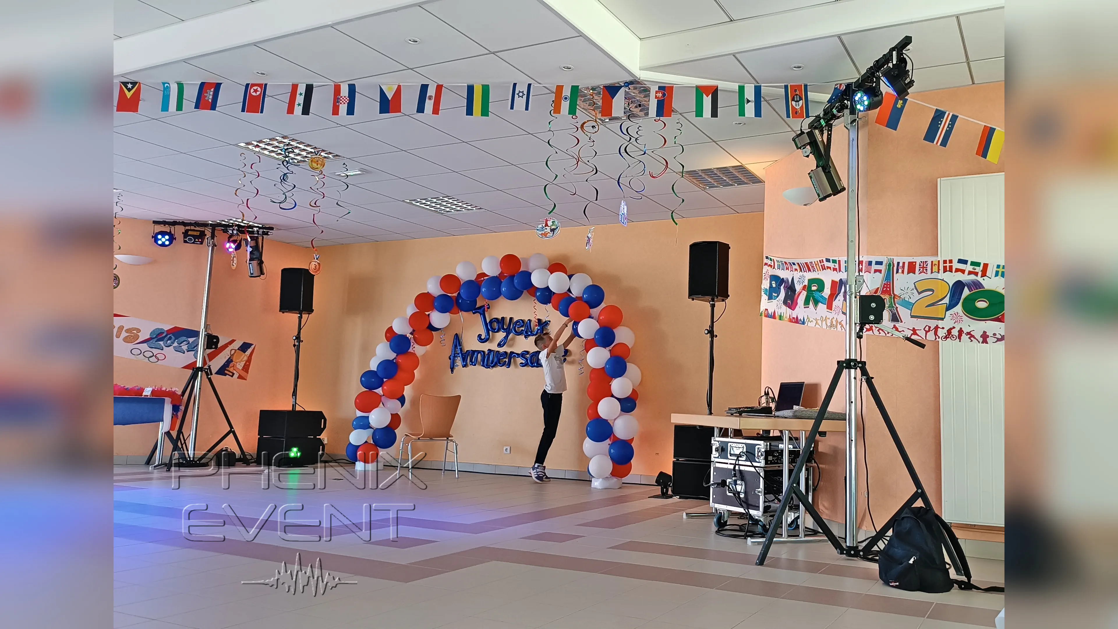 matériel de sonorisation 1900w Stack et d'éclairage Pack Fête 1 installés de parts et d'autres d'une arche de ballons tricolore. Un enfant attache un ballon.