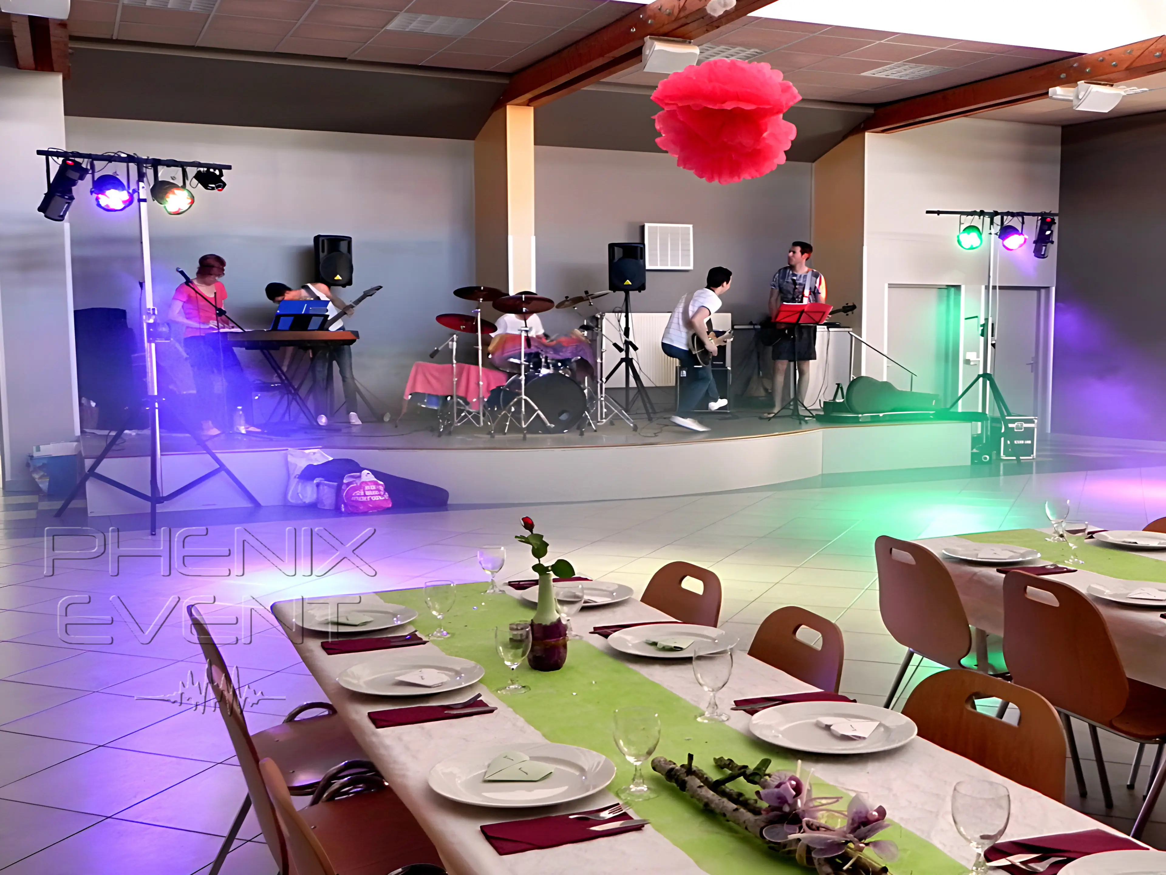 Pour le déroulé de la fête, Timothée a tout prévu : son groupe de potes monte sur scène et la sono est gérée par les musiciens eux-mêmes. Quant à nous ? Eh bien, on s’occupe du reste ;). Direction donc la salle des fêtes de Freistroff pour installer un Pack Fête 1, notre pack de jeux de lumière dynamique made in Phenix Event et le Pack Vidéoprojecteur, made in nous également –