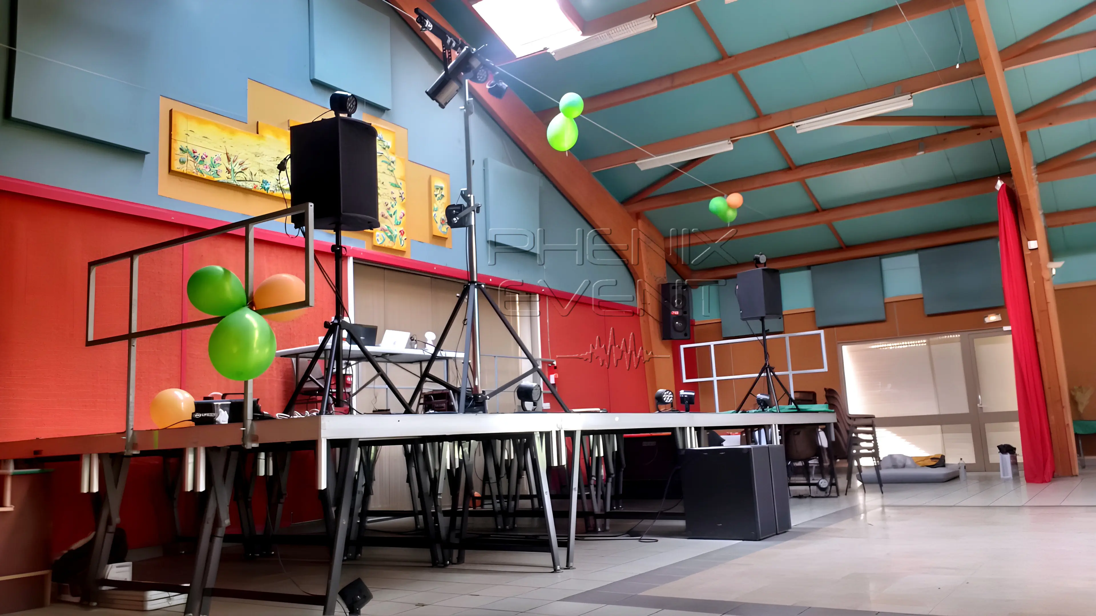 A mon arrivée à la salle, c’est le futur marié, Didier, qui me réceptionne. Poignée de main franche, sourire jusqu’aux oreilles (s’il avait pu aller au-delà, il l’aurait été), le courant passe immédiatement ! Il se propose même pour aider au déchargement de la cargaison… (ce que je refuse : il doit garder des forces pour les événements à venir ! ^^. Mais l’intention était très gentille et honorable). Ni une ni deux, je prends connaissance des lieux : la salle est grande, spacieuse et, chose non-négligeable, une scène de 8x3m assemblée à l’aide de praticables est déployée. Parfait pour y agencer notre arsenal et ça va clairement, en sus, accélérer le processus :
