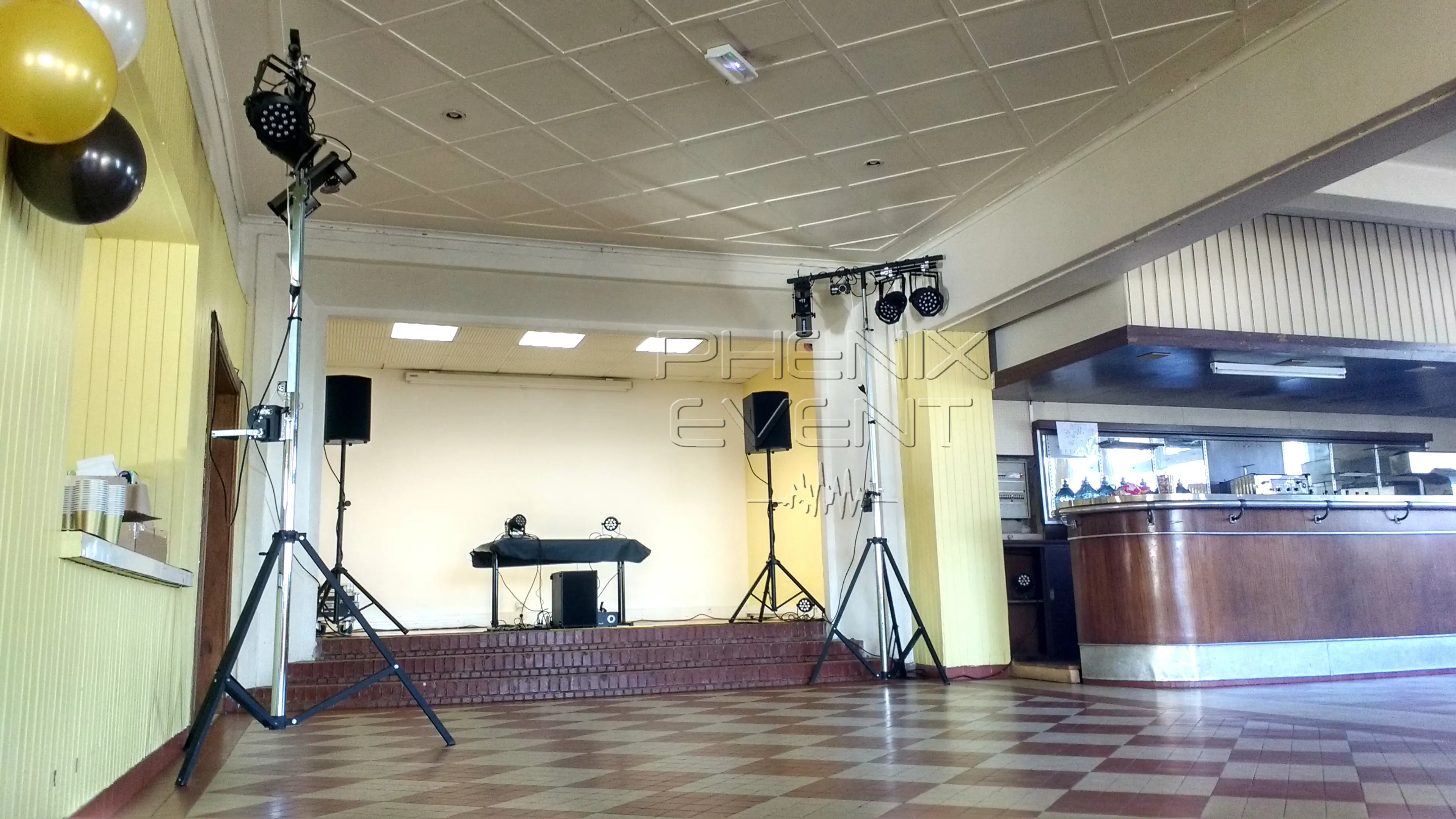 Vient ensuite le placement des trépieds et les jeux de lumière du Pack Fête 1. Comme il est coutume dans cette salle, je les place au bas de la scène, un à gauche un à droite, dans l’optique qu’ils « lumiérisent » parfaitement la piste de danse.