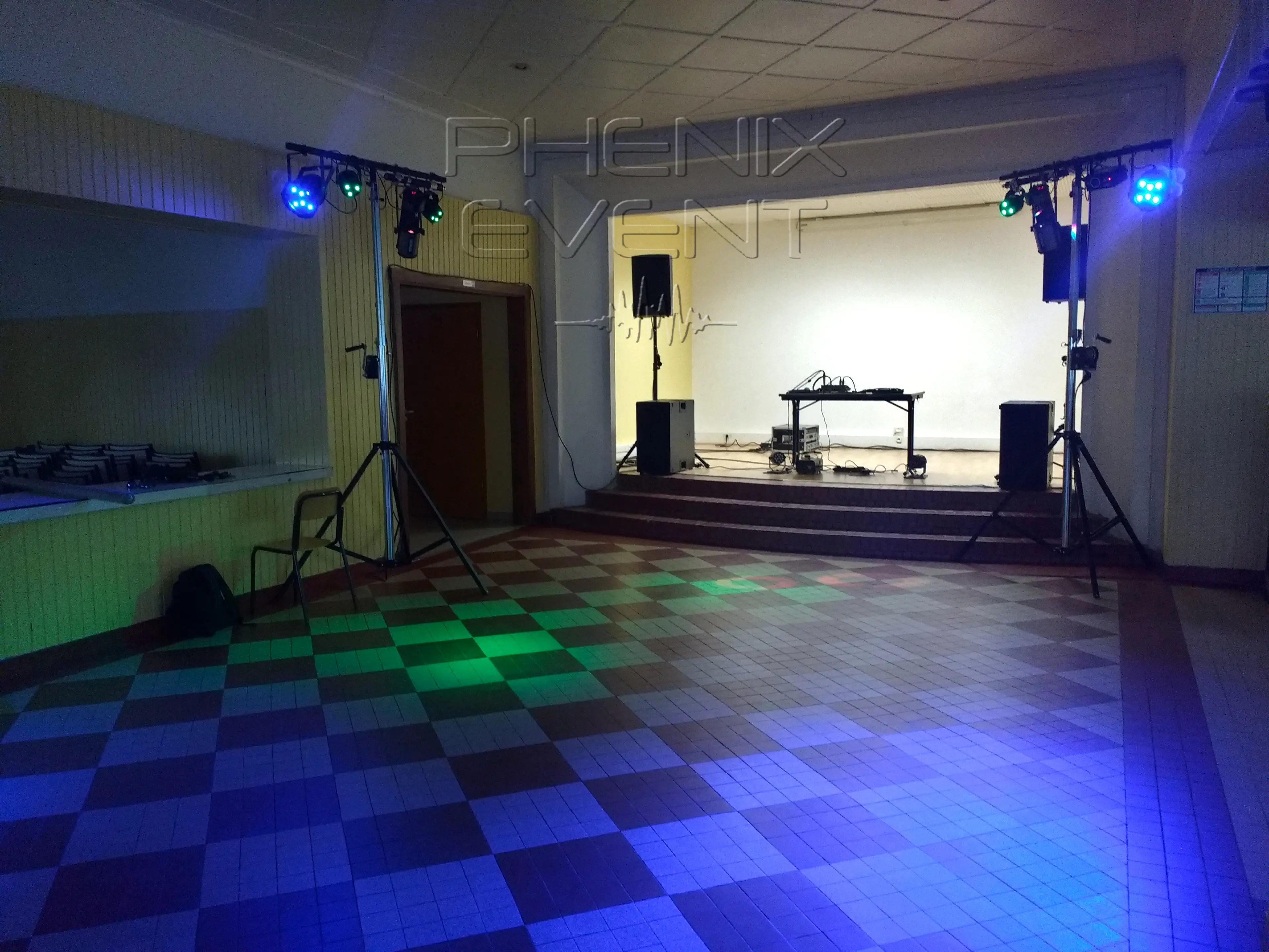 Compte-tenu de la configuration de la salle et des systèmes son & lumière commandés, peu de configurations sont possibles. C’est pourquoi je place une enceinte 500w sur trépied côté cour et l’autre côté jardin.