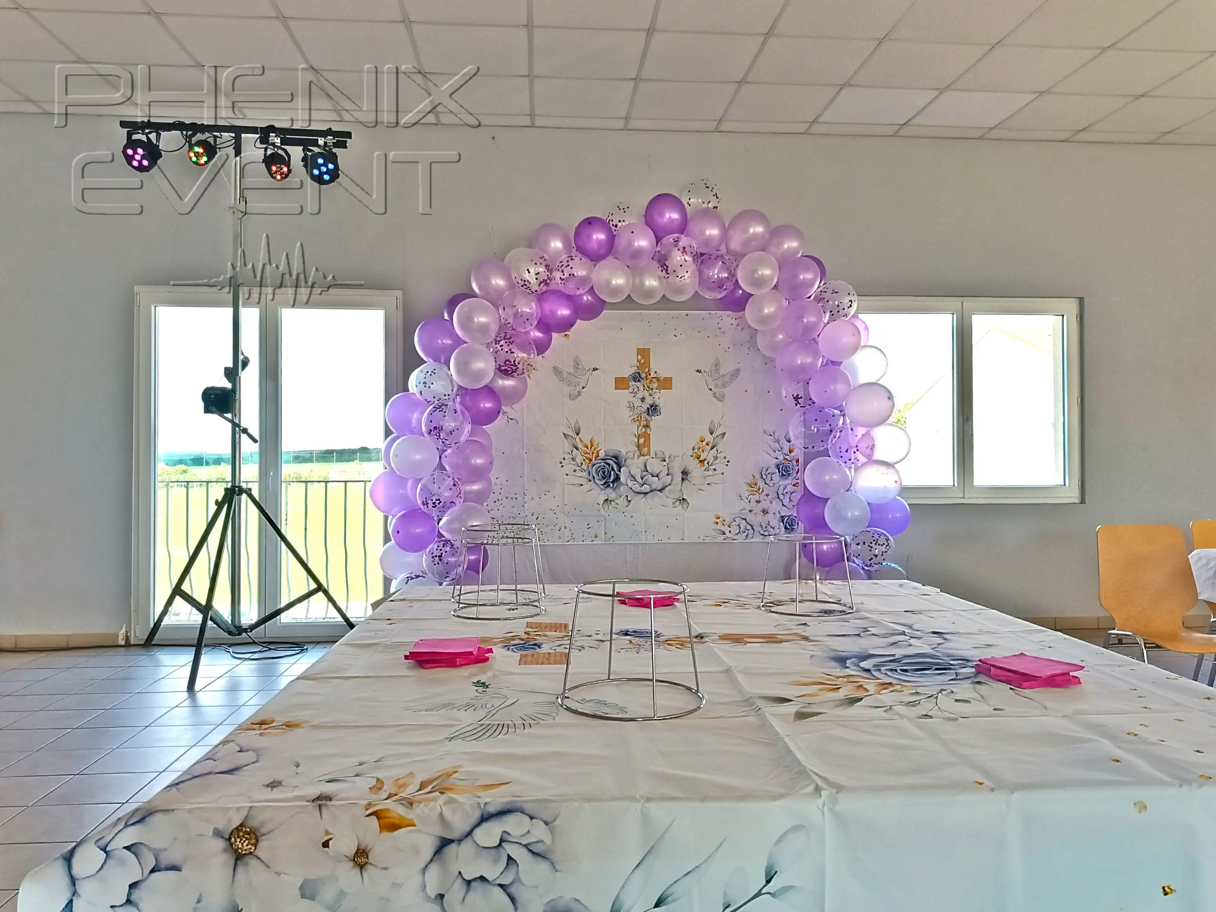 Les décorations, comme l’arche de ballons mauves et les tables élégamment dressées, complètent l’ensemble. Un des deux modules du Pack Projecteurs 2PHENIX EVENT s’intègre parfaitement.