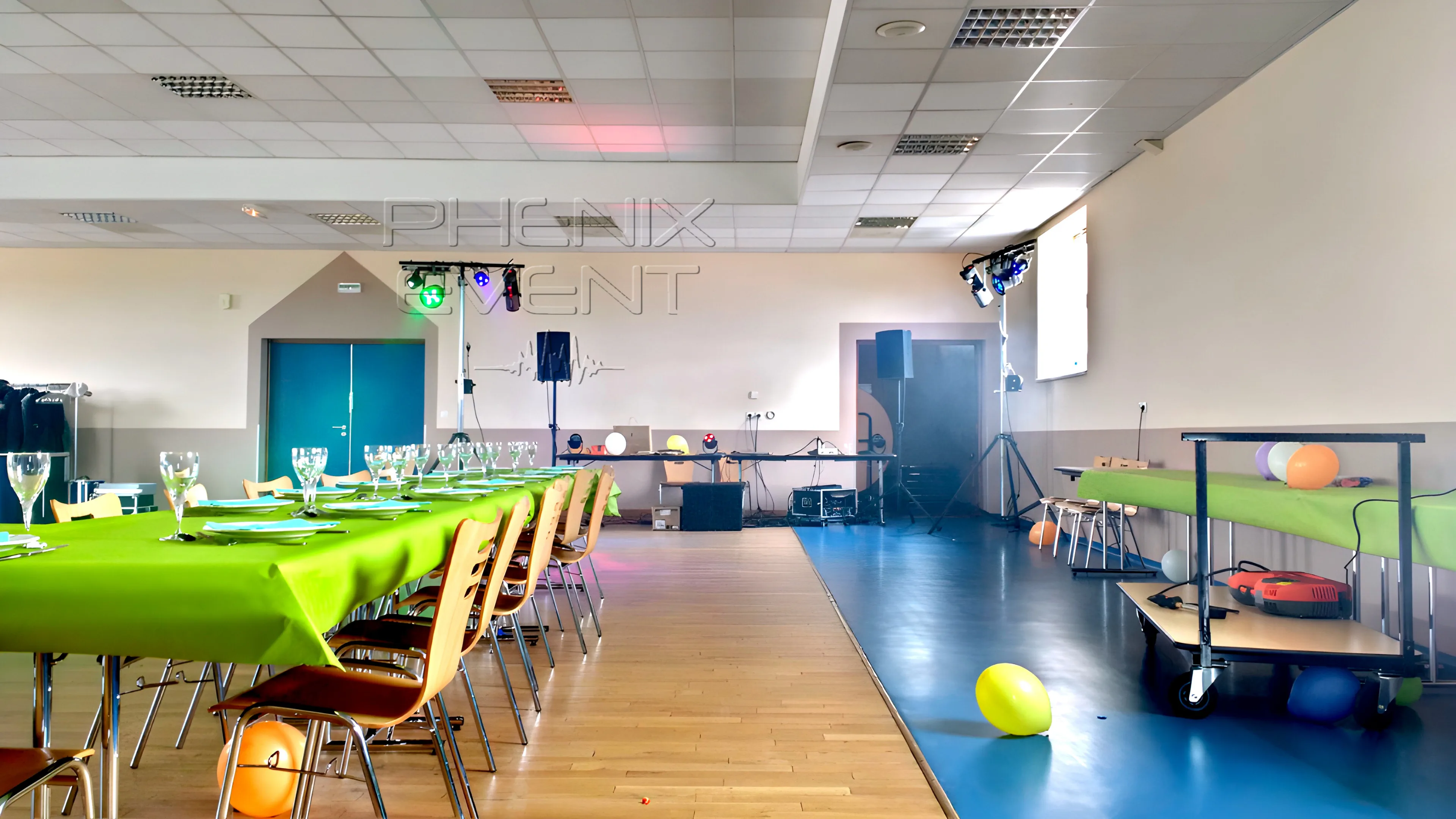 Vient ensuite le tour de l’installation du Pack Fête 1 : la place disponible restante accueille un trépied à treuil à gauche et je cale l’autre trépied à droite. Je les équipe avec les spots, le laser et les deux scanners. Orientation des projecteurs vers la piste, hissage du tout. Je plug, le système éclaire la piste et montre direct une preview du dynamise du jeu de lumière à Kévin. Il fait, à ce moment-là, encore plein jour et la salle ne possède pas d’occultants, mais nul besoin de beaucoup d’imagination pour voir et savoir qu’une fois le crépuscule arrivé, le spectacle éblouissant sera.
