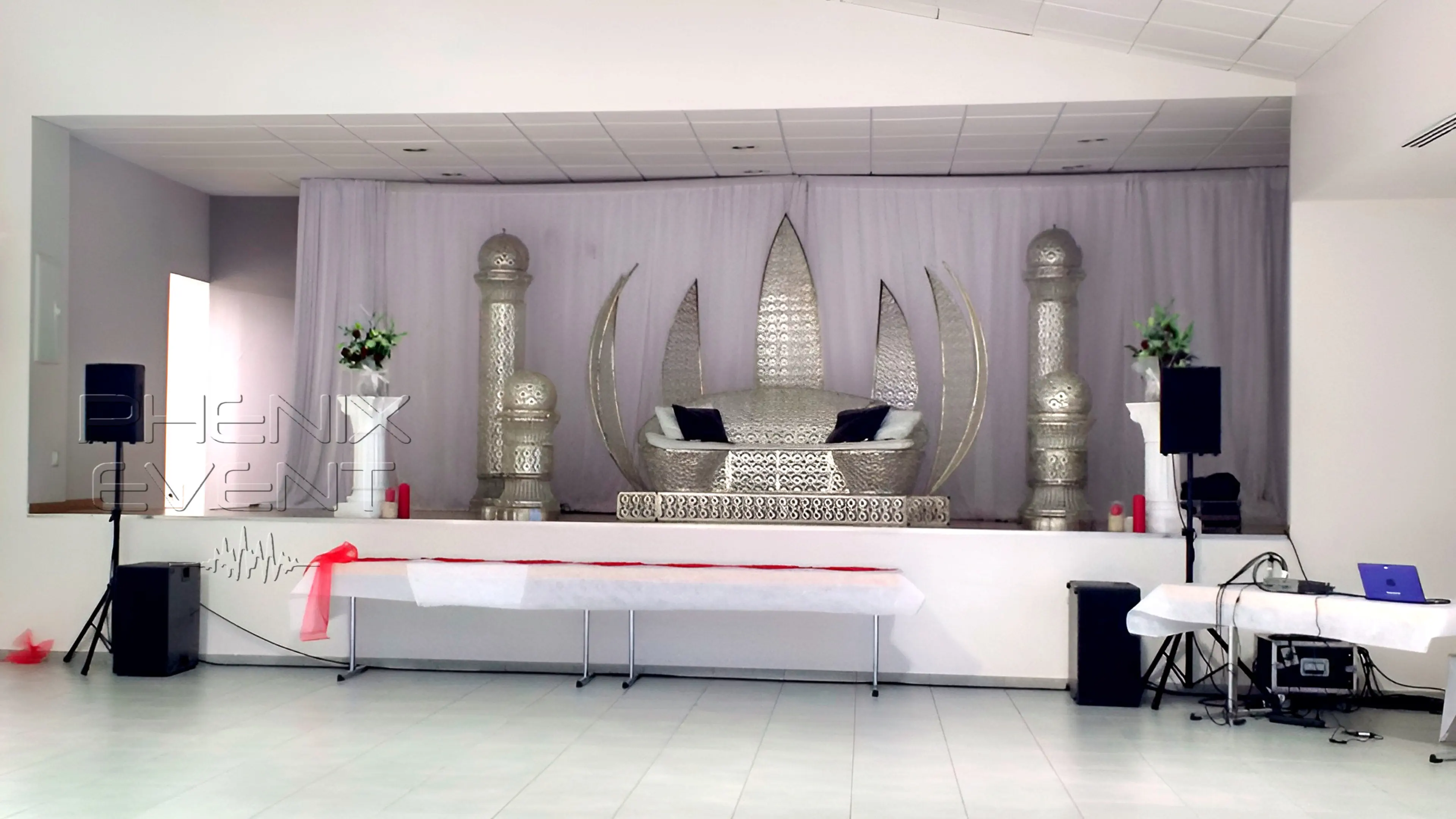 Scène décorée avec du mobilier oriental et le système de sonorisation 2000w Phenix Event installé au sol.
