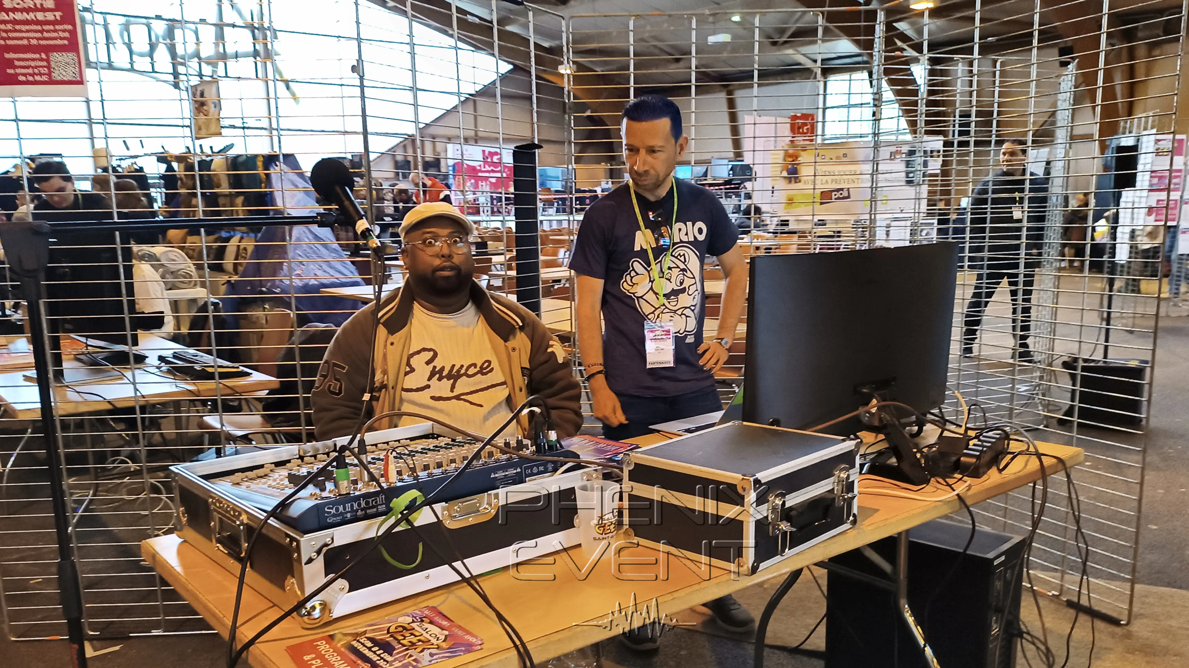 Je sors et déploie les racks d’amplis puis on enchaîne, avec Peck, sur le déploiements des téléviseurs. Je fournis également un micro HF pour les annonces et la remise des prix sur la scène principale, comme il était convenu.