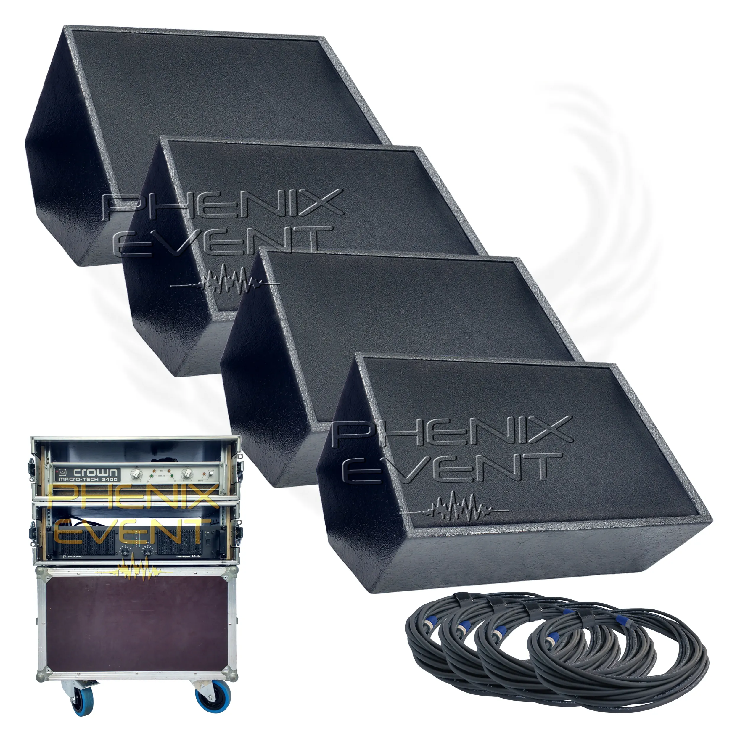 Pack de retours de scène 2000w constitué de quatre enceintes 500w, un rack d’amplification incluant deux amplis professionels et quatre câbles SpeakOn.
