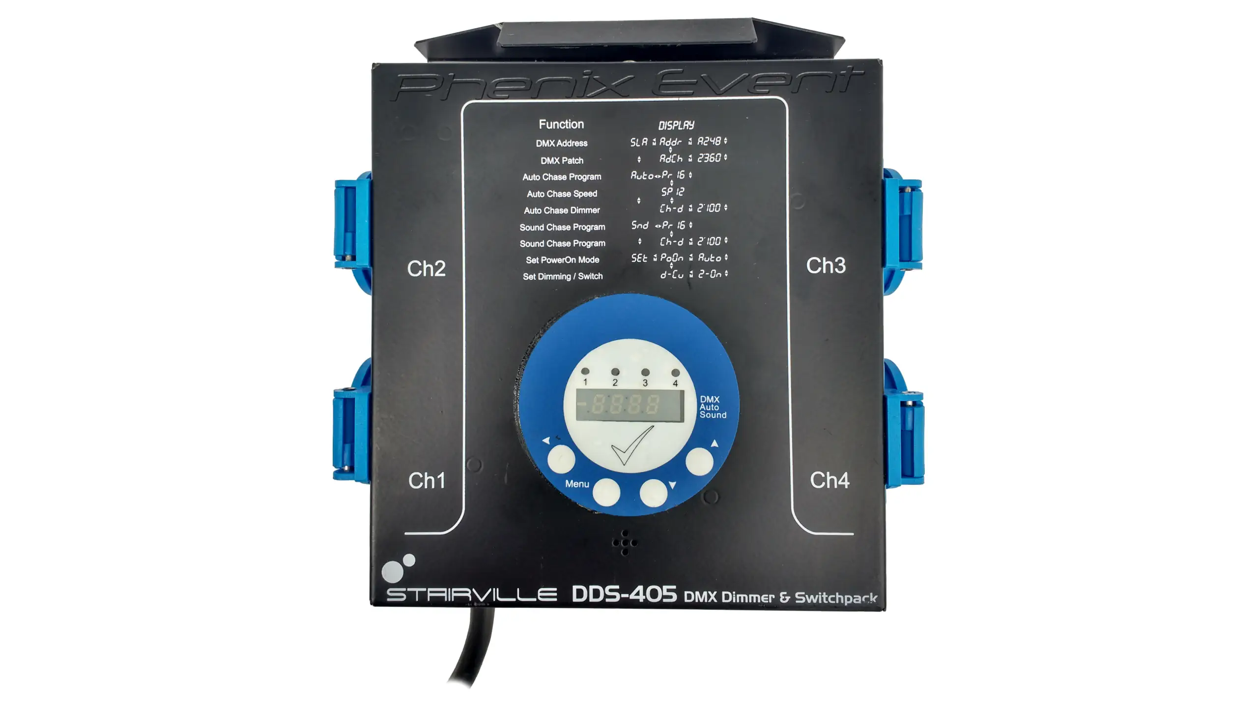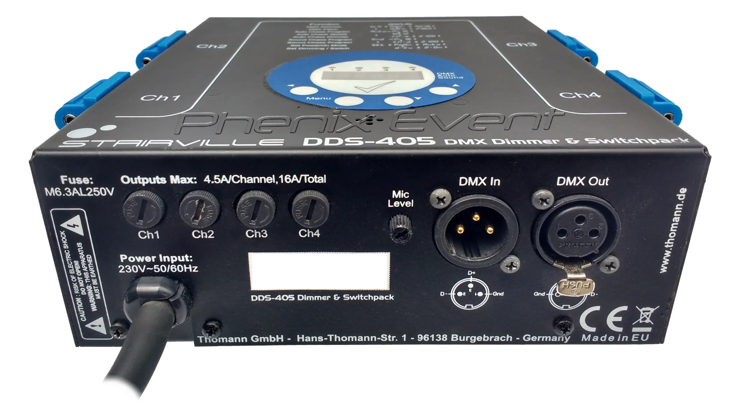 Variateur d’intensité électrique Stairville DDS 405 DMX Dimmer & Switchpack pourvu de 4 prises 16A monophasées.