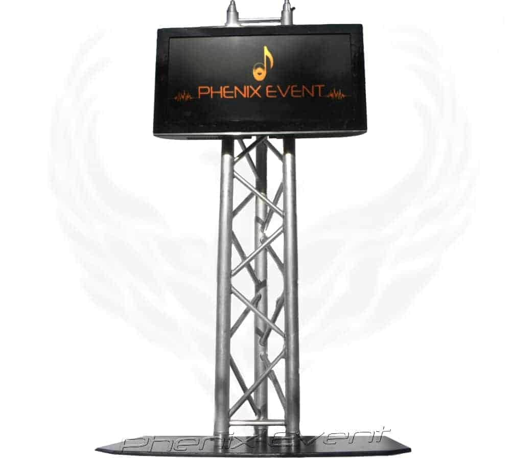 Un Totem TV est un dispositif multimédia composé d’un écran de télévision fixé sur un pont en aluminium triangulaire.