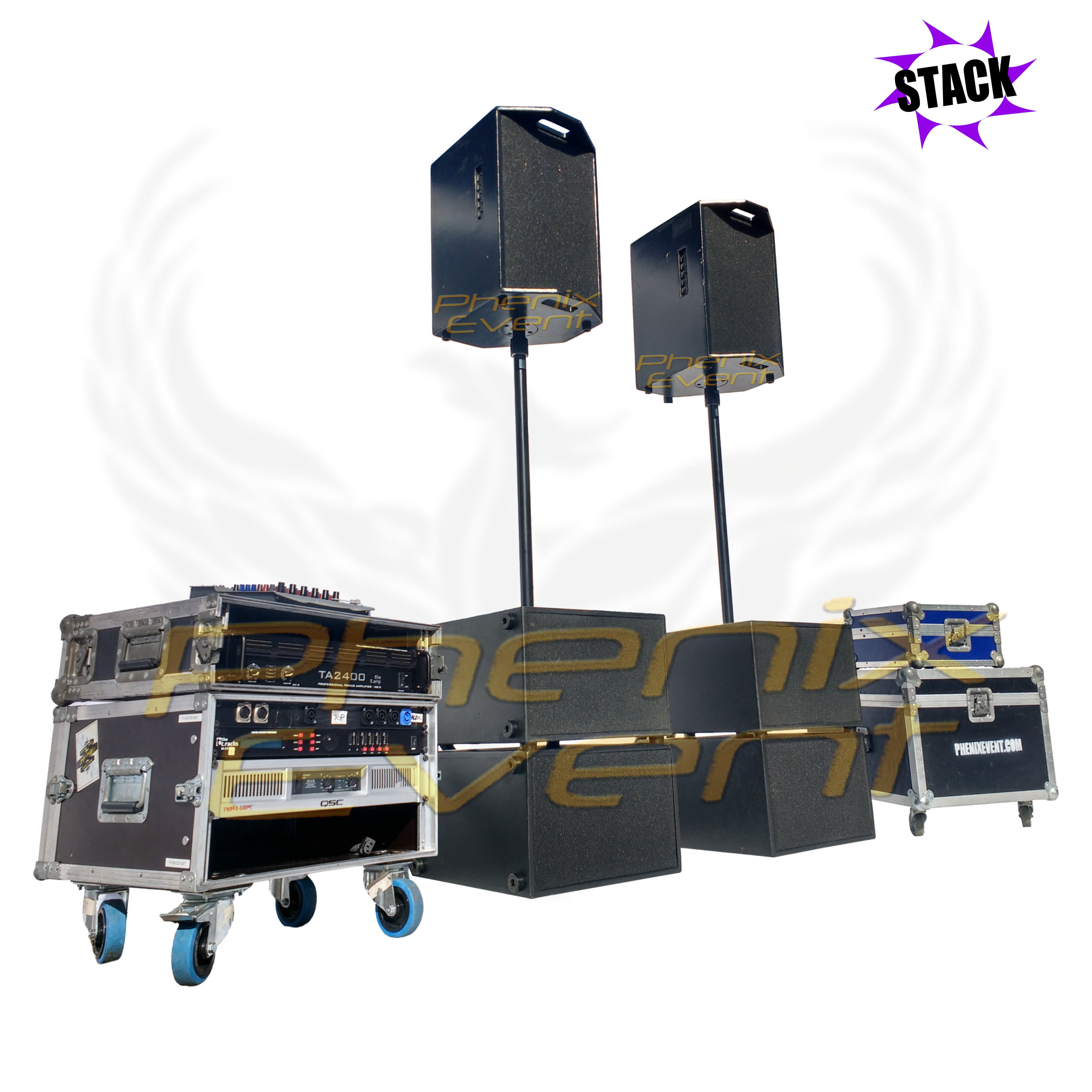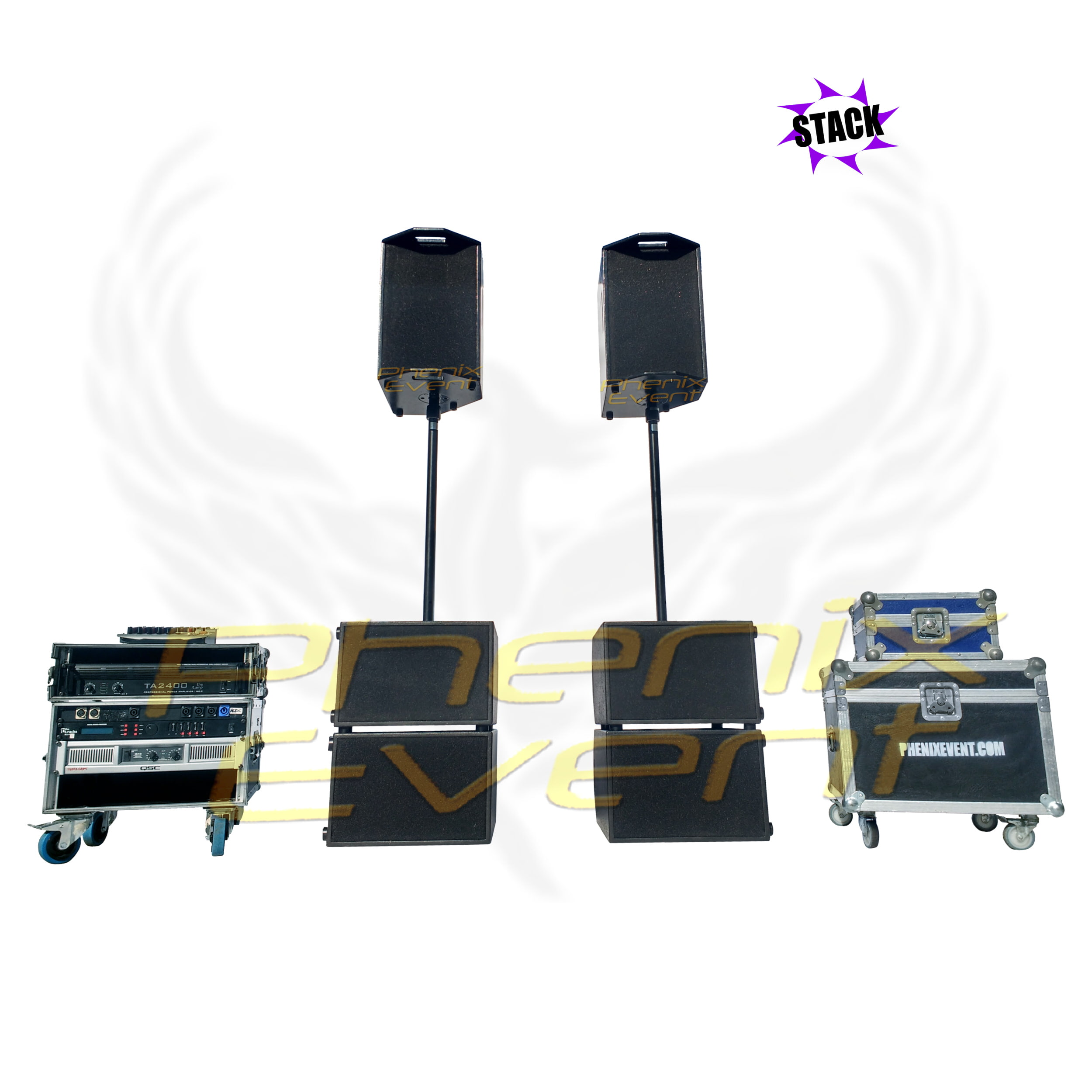 Le système Sono 1900w rms 10X410T-STK STACK s'équipe de 2 enceintes 250 watts, de 4 caissons de basses 350 watts compacts ainsi que 2 tubes de liaison enceintes/caissons.