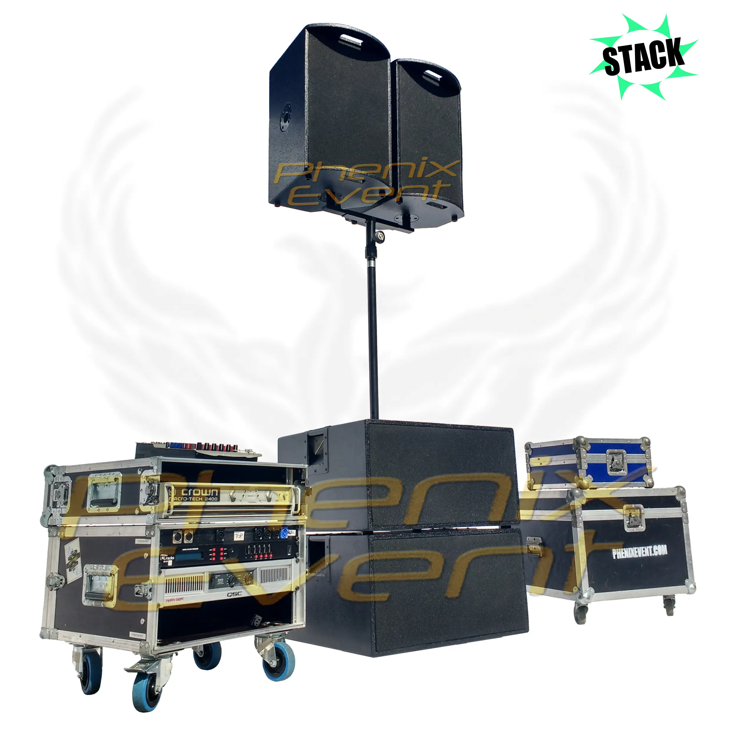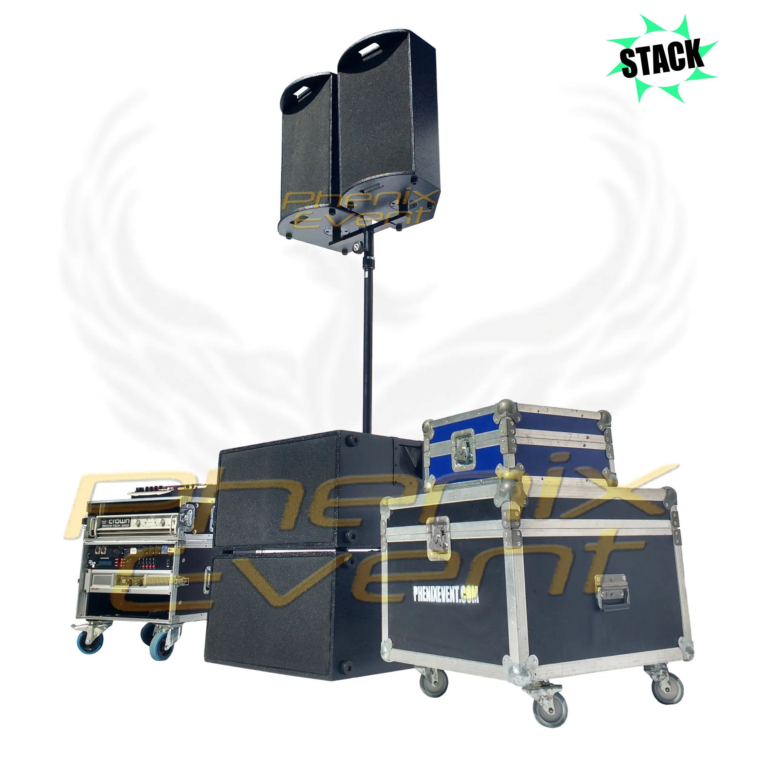 De plus, Phenix Event décide de mettre à disposition 2 amplificateurs de puissance reconnus. L’un destiné à amplifier les fréquences aiguës et médiums, l’autre sert les basses. Ces amplificateurs ont fait leur preuves dans le monde de la sonorisation. Ainsi, grâce à cet équipement, le pack sono 2000w rms, dans toute sa puissance révèle sa finesse. De ce fait vous obtenez une qualité de son digne couplée à une pression acoustique non-négligeable. Enfin, l’ensemble du système d’amplification est conditionné dans un rack (flight case) pourvu de roulettes. Un élément mobile et agençable selon désirs.