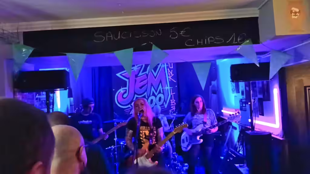 Sur la scène du Shamrock Pub à Thionville, Jem 2000 livre une performance intense de « Vie Suspendue », un morceau résolument punk rock, original, entièrement composé par le groupe.